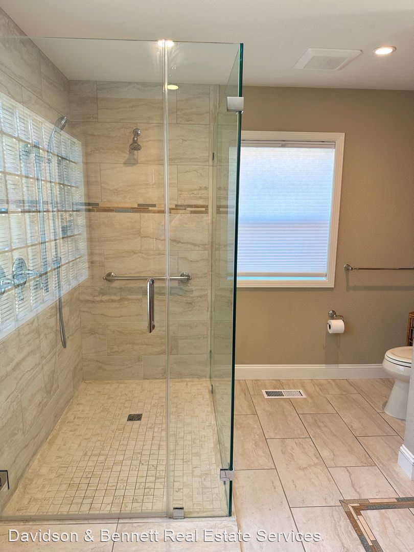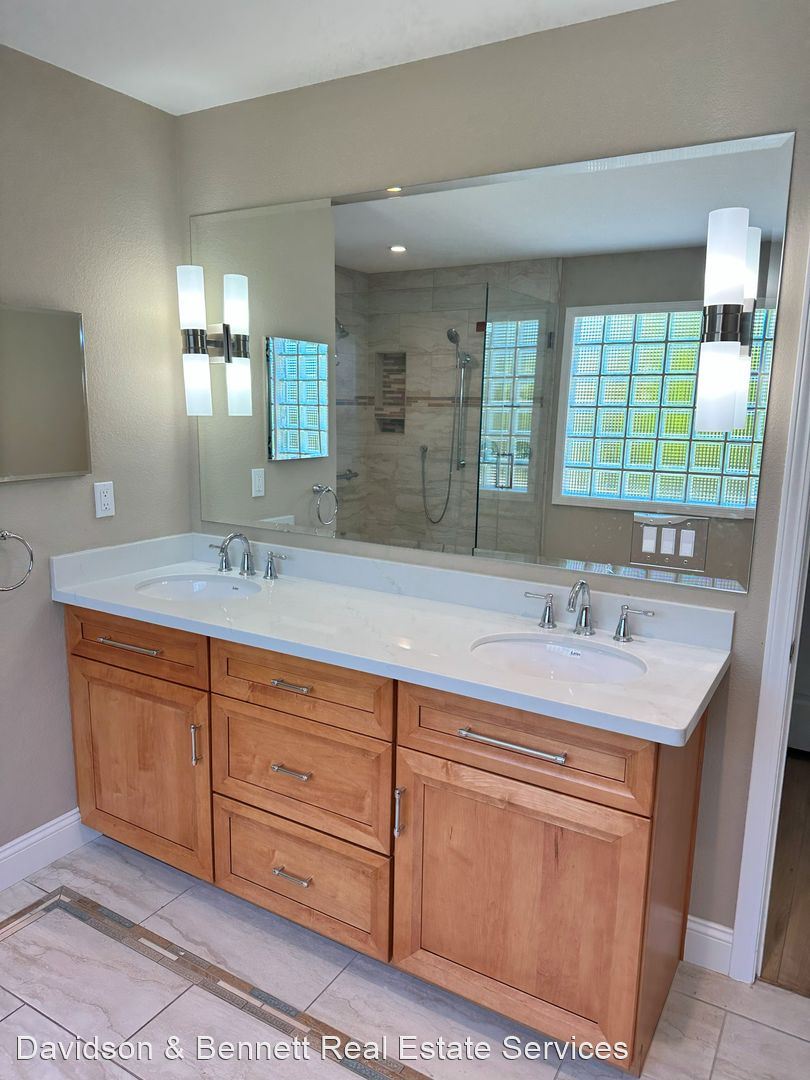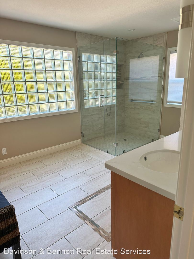 Primary bathroom has over sized shower and double sink vanity.