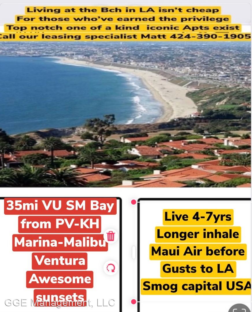 Call Matt at 424-390-1905 or 310-376-8868 - This is our flagship building: Here at Crystal Cove life at our beach is a rare privilege for those questing for the healthiest lifestyle in LA County. Welcome to whitewater paradise. Breathe air from Hawaii before it gusts to LA(smog capital of USA) live 3-5 yrs longer inhaling healthy air. Quality of life improved immensely if you have hay fever, asthma, allergy, and emphysema.CA rated#1 beach bike path. Every bldg has been earthquake Retrofit or has huge amounts of steel and concrete dedicated to the parking structures which diminishes the risk to life and property during a CA earthquake. Crystal Cove at 18 feet to the surf is closer to water than the lifeguard station. In fact, it's closer to the surf than any apartment complex in all of Southern California. With 35-mile views of Santa Monica Bay from the red tile roofs of Palos Verdes to the Malibu Colony and on to Ventura, It commands the beach scene from Torrance to Redondo Beach, Hermosa Beach, Manhattan Beach, El Segundo and is endowed with two private beaches (North and South) where weddings and catered events take place. Many residents have commented that It is a privilege to reside at Crystal Cove Apartments. Additionally, the Chart House Restaurant is attached to our complex for whitewater dining. Pods of Whales and Dolphins are seen daily while Hawks, pelicans, sea gulls and Falcons ply the skies above. Beach hot spots are everywhere to be found with celebrities in evidence from their nearby designer condos and homes. CA lifestyle is alive well and thriving. Join in and live the healthy CA beach life. Four challenging golf courses including Trump National are in the immediate vicinity. Our formerly dark and dingy parking have become palaces with the installation of state of the art emergency LED lighting lending safety in getting from your door to your car at nighttime. With the electrical grid predicted to be down more often ladies have commented on how they appreciate the safety at night especially wearing high heels. Solar energy panels are installed to take advantage of renewable energy and do our part in diminishing global warming. This year CC is off fossil fuel in favor of solar energy. Congratulations ! Private Beach available by request. EQUAL HOUSING OPPORTUNITY: Our housing is available to everyone regardless of familial status, sex, handicap, race, color, religion or national origin. DISCLAIMER: We are not responsible for the accuracy of information contained in these ads. Although we try to avoid errors we are not responsible for any mistakes in pricing, features or terms. Please call the leasing department to confirm information and availability. RATES ARE SUBJECT TO CHANGE WITHOUT NOTICE. All Rates herein are intended for use by walk-in applicants only. If you have a Broker or Realtor that you are working with then you must contact your agent for Rates which they can find using the Multiple Listing Service (MLS).