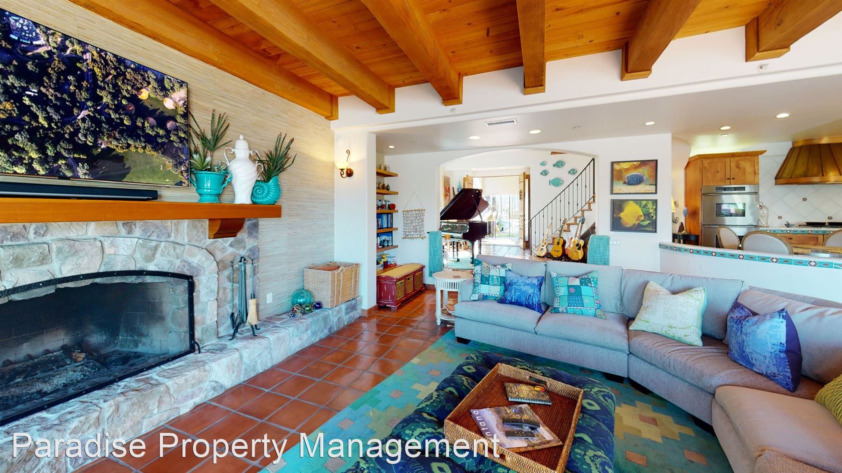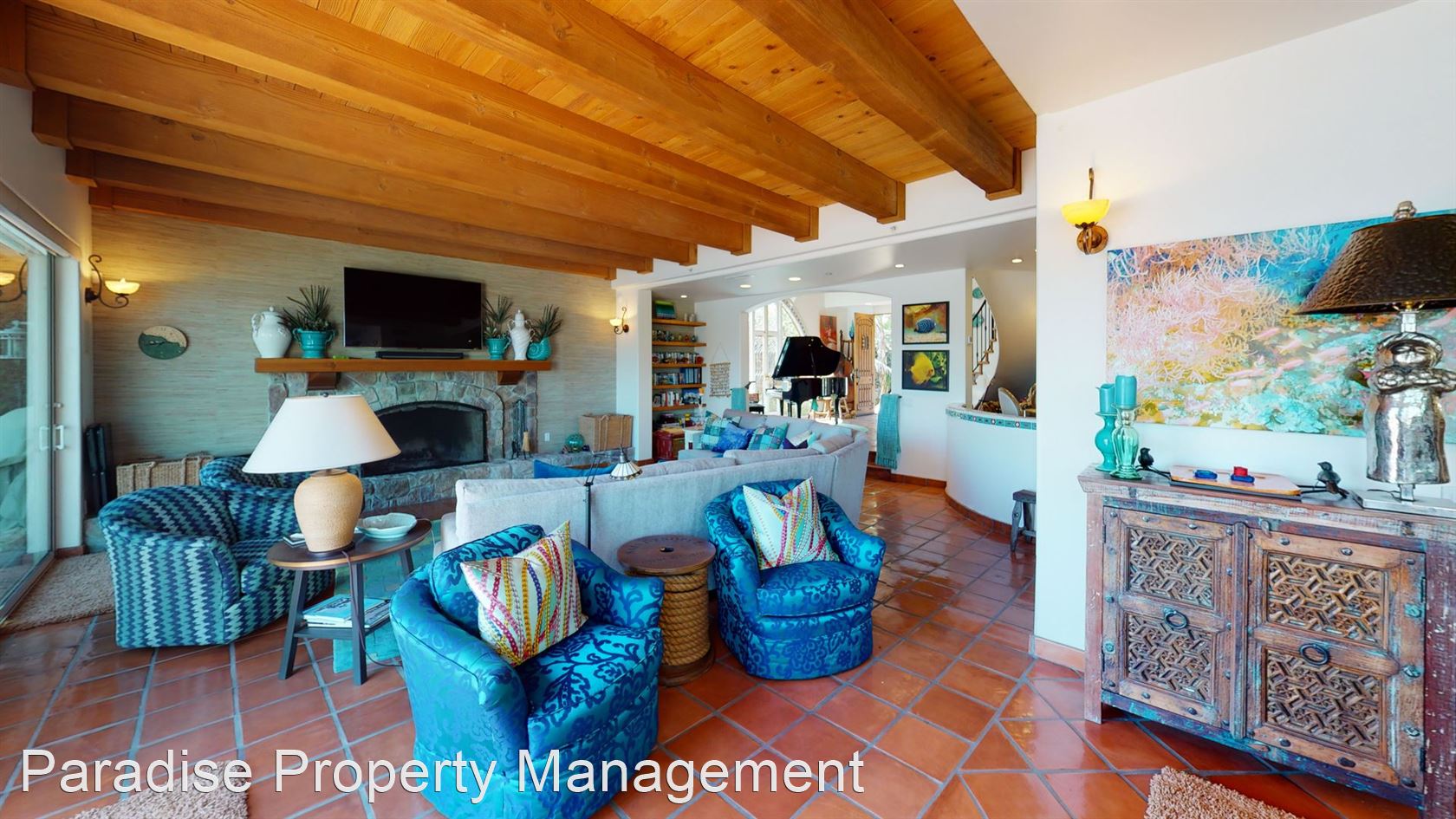 The large open living room features a stone wood-burning fireplace, natural wood beam ceilings and again that special water view.