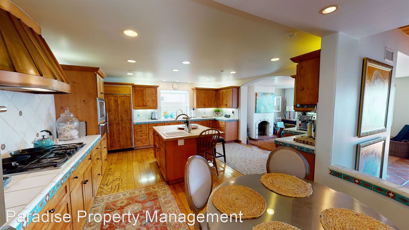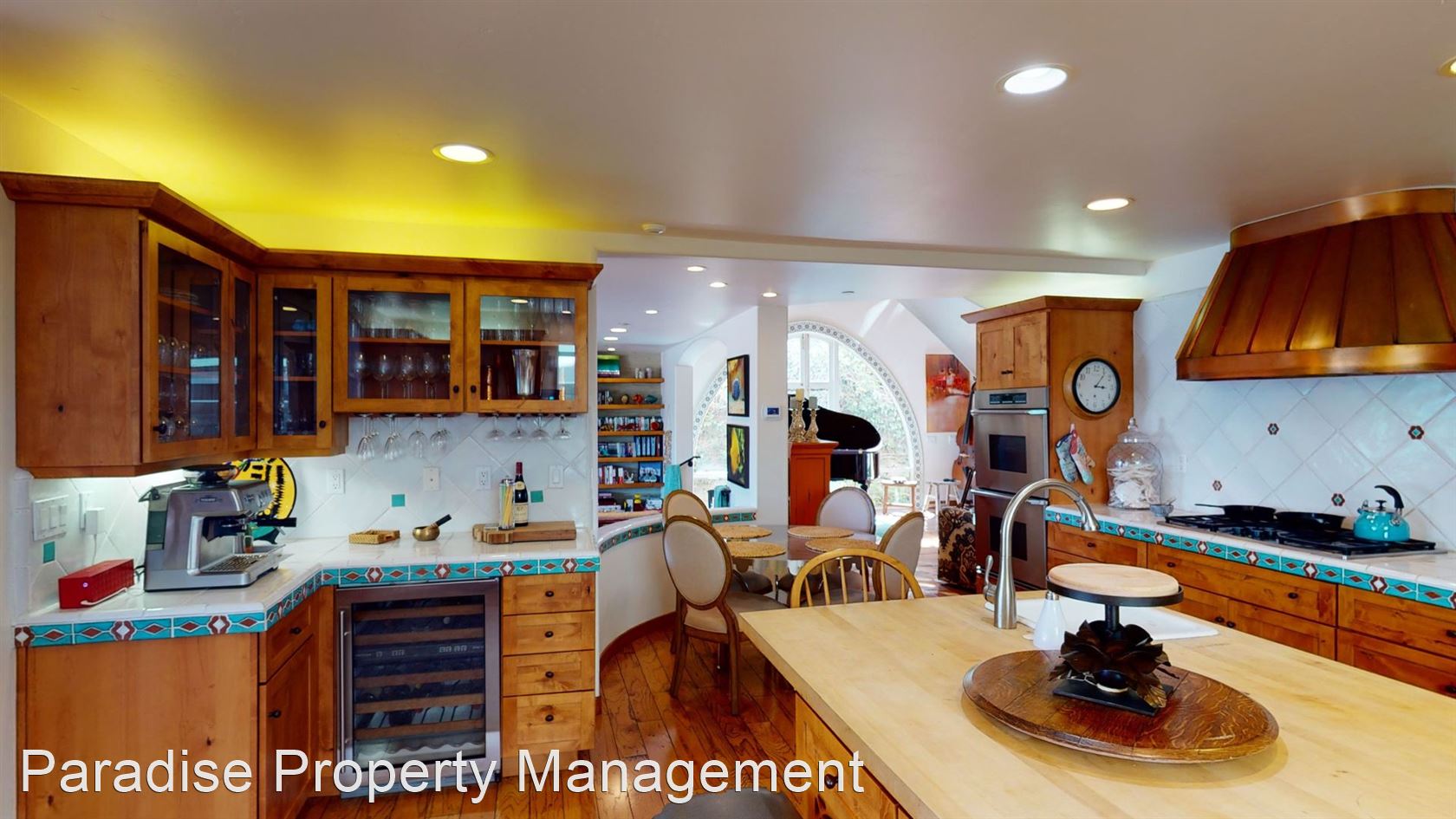 Enjoy a large open kitchen with built in refrigerator, and all stainless steel top-end appliances including Dacor dual convection wall ovens, 5 burner gas cooktop, built-in Dacor microwave oven, Dacor warming drawer, Sub Zero refrigerated drawers in center island, and wine refrigerator.
