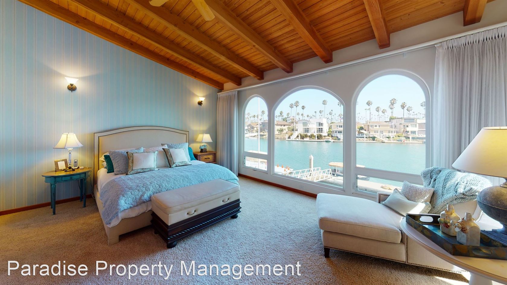 The first master suite has wood beam vaulted ceilings, custom wall sconces, a large walk in closet and en-suite bathroom with dual vanities, and the second master suite features a stone gas fireplace, amazing water views, vaulted wood beam ceilings, en-suite bathroom, and walk-in closet.