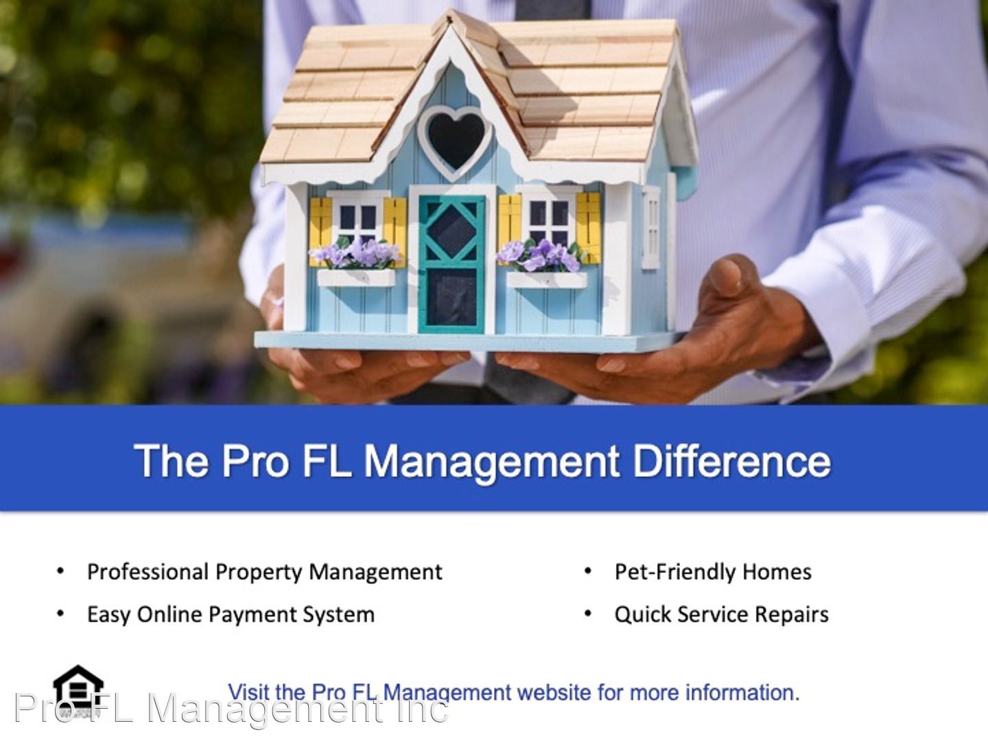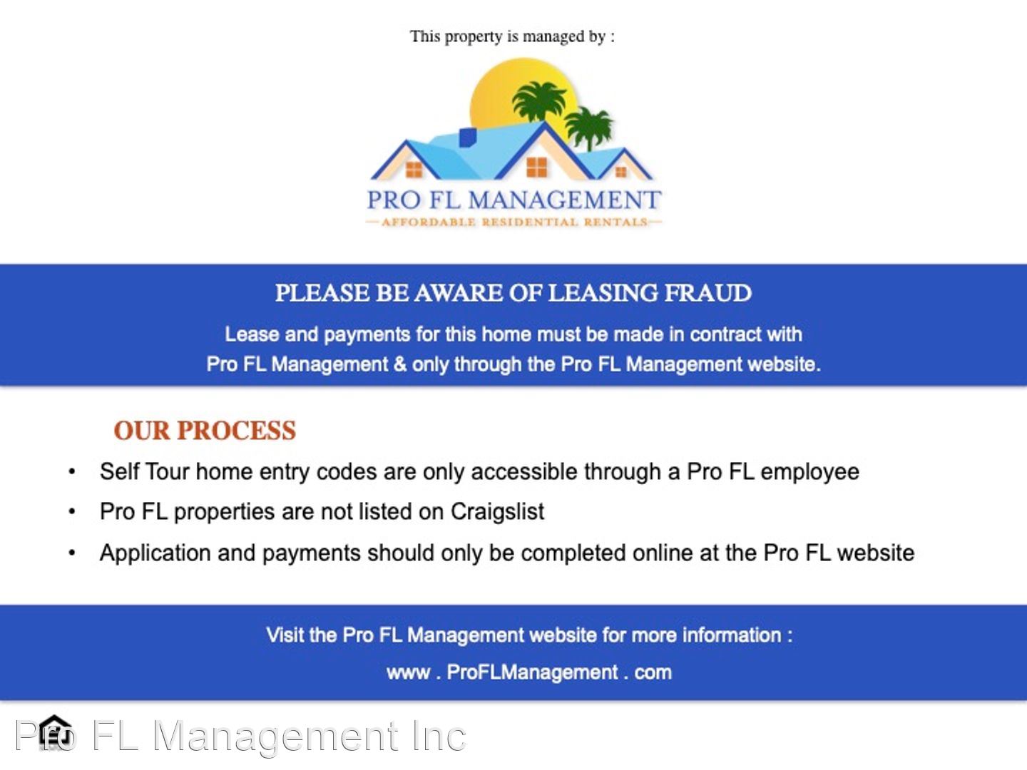 BE AWARE: Scams are operating in this region. Pro FL Management Inc will never advertise on Craigslist or Facebook, ask you to wire money, or ask you to keep the key to the home for move in.
