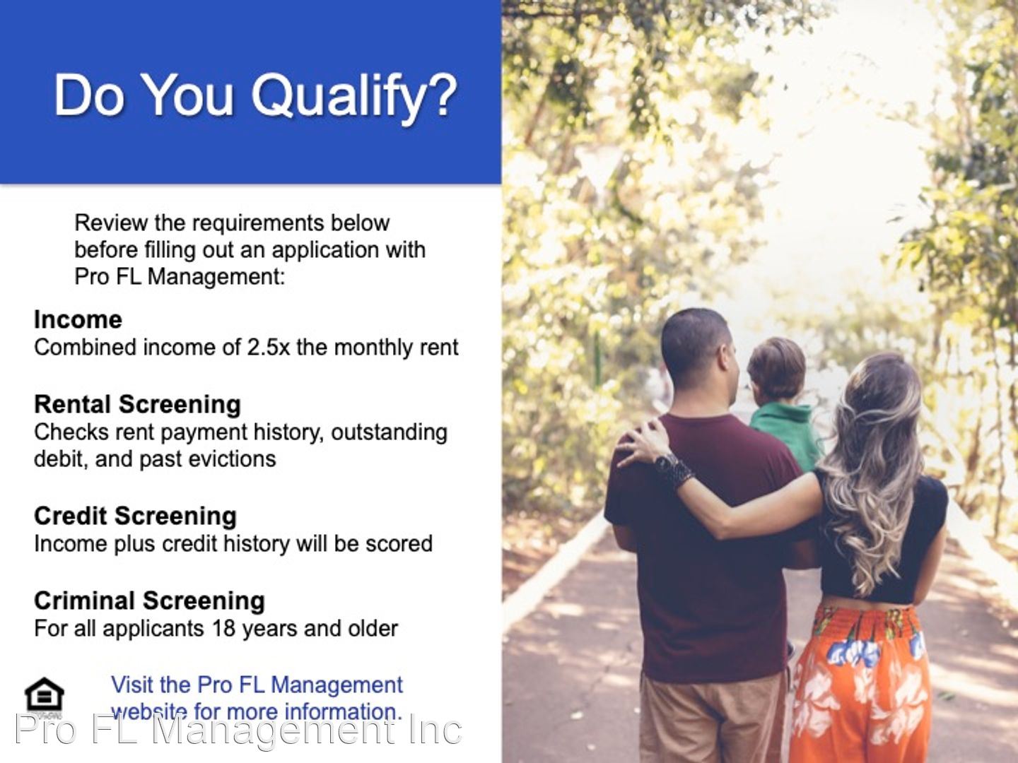 Apply directly on the Pro FL Management website. The application fee is $74.99 per adult. All applications are transferable to any available properties. Also check out our FAQ tab on our website, that can answer most questions regarding the application process and qualifications necessary.