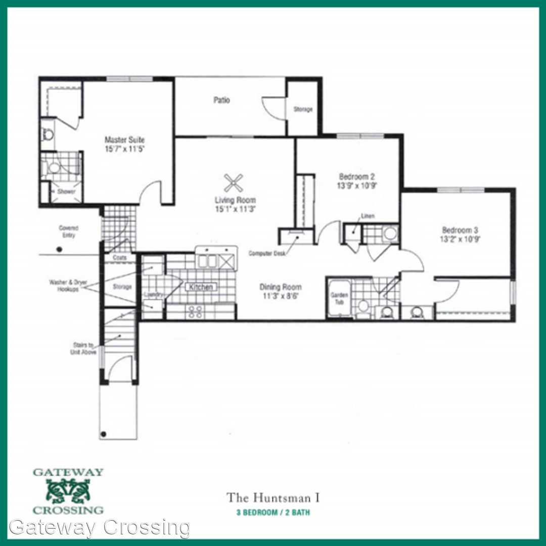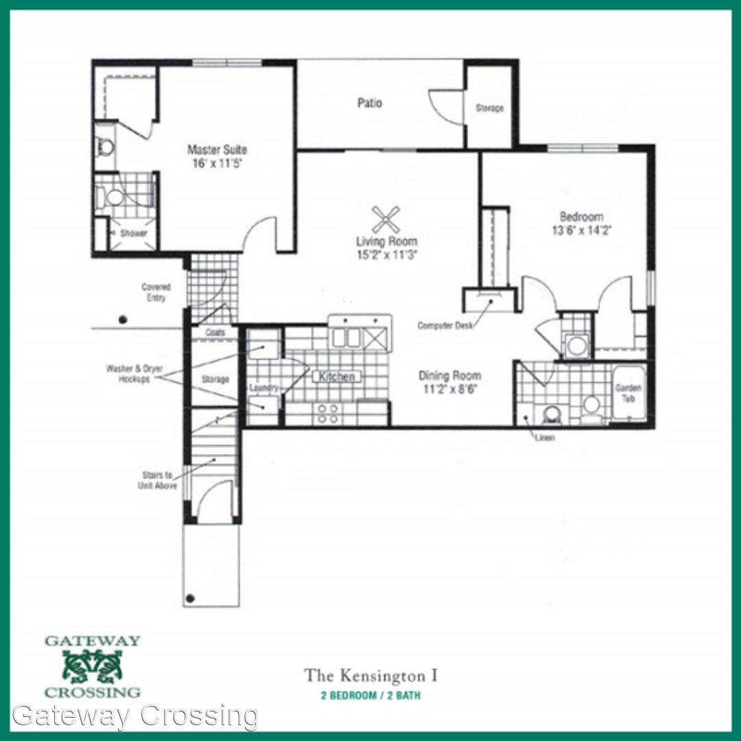 Kensington I Floorplan - This 2 bedroom apartment, the “Kensington I,” features 1,120 square feet! The private entry to the apartment is through a beautifully landscaped and lighted courtyard. The apartment’s entry features tile flooring and a huge coat/storage closet. The apartment’s living room is very spacious with room for a full size couch, love seat or chair, coffee table, and entertainment center. The living room includes two separate cable connections for convenience as well as a ceiling fan. Off of the living room is a private 13 x 7 patio with 7 x 3 storage closet. The apartment has an open concept with the living room, kitchen, and dining room all being open to each other, creating a great space for entertaining. The kitchen is perfect with oak cabinetry and newer appliances including a built-in microwave, dishwasher, stove and refrigerator. Attached to the kitchen is a full size washer/dryer connection. On the opposite side of the kitchen is a dining room with chair rail and room for a table for six. In the hallway is a built-in computer desk. This 2 bedroom apartment has two very large bedrooms. The first bedroom, in the front of the apartment, is huge! This bedroom will not only accommodate a king size bed, but will accommodate the king size furniture to go along with it. This bedroom also has its own private bathroom with full size shower. The second bedroom is on the opposite side of the apartment. This bedroom has room for a king size bed, dresser, and it includes two full size closets (one a walk-in)! Across the hall from this bedroom is another full bathroom with garden tub and linen closet. What a great apartment!