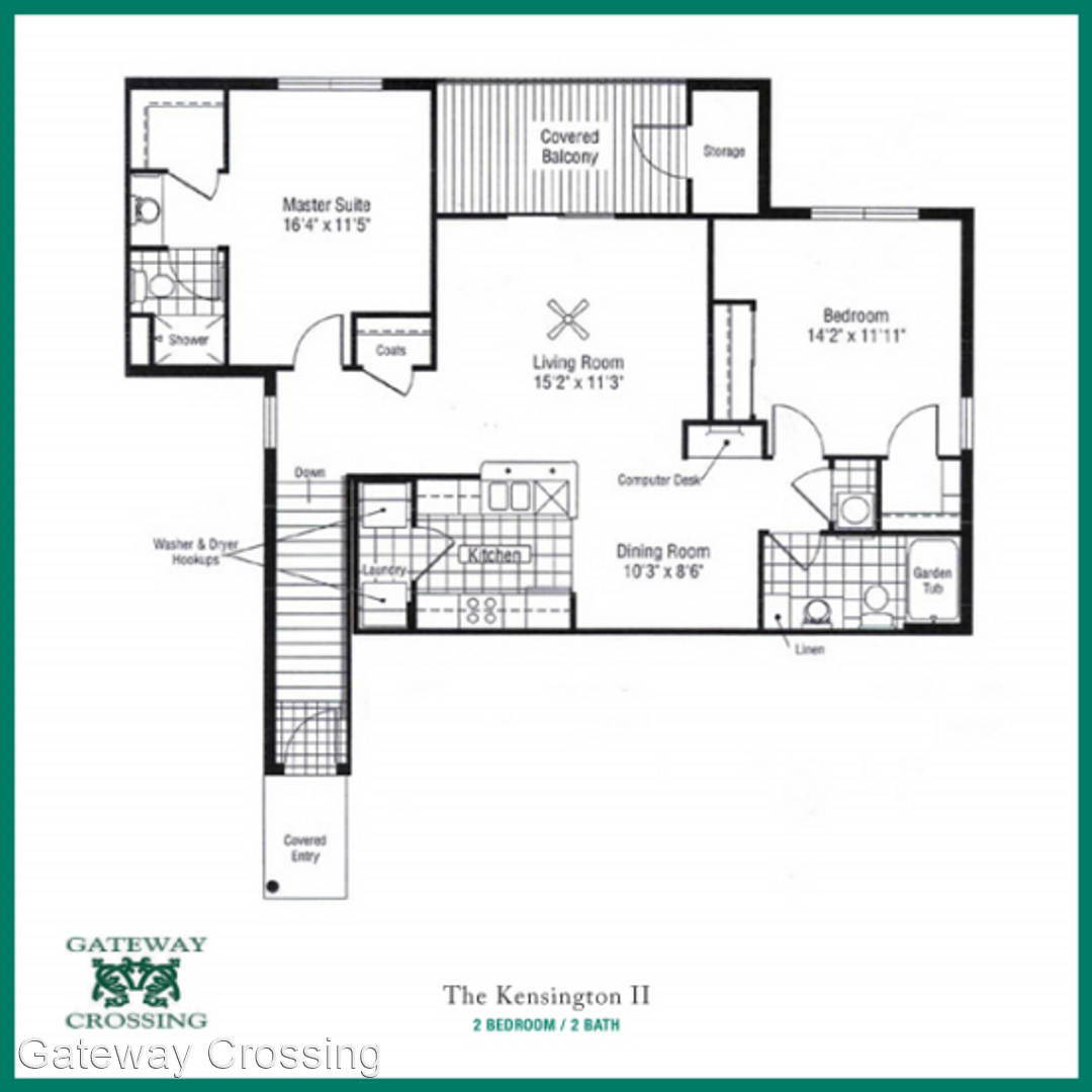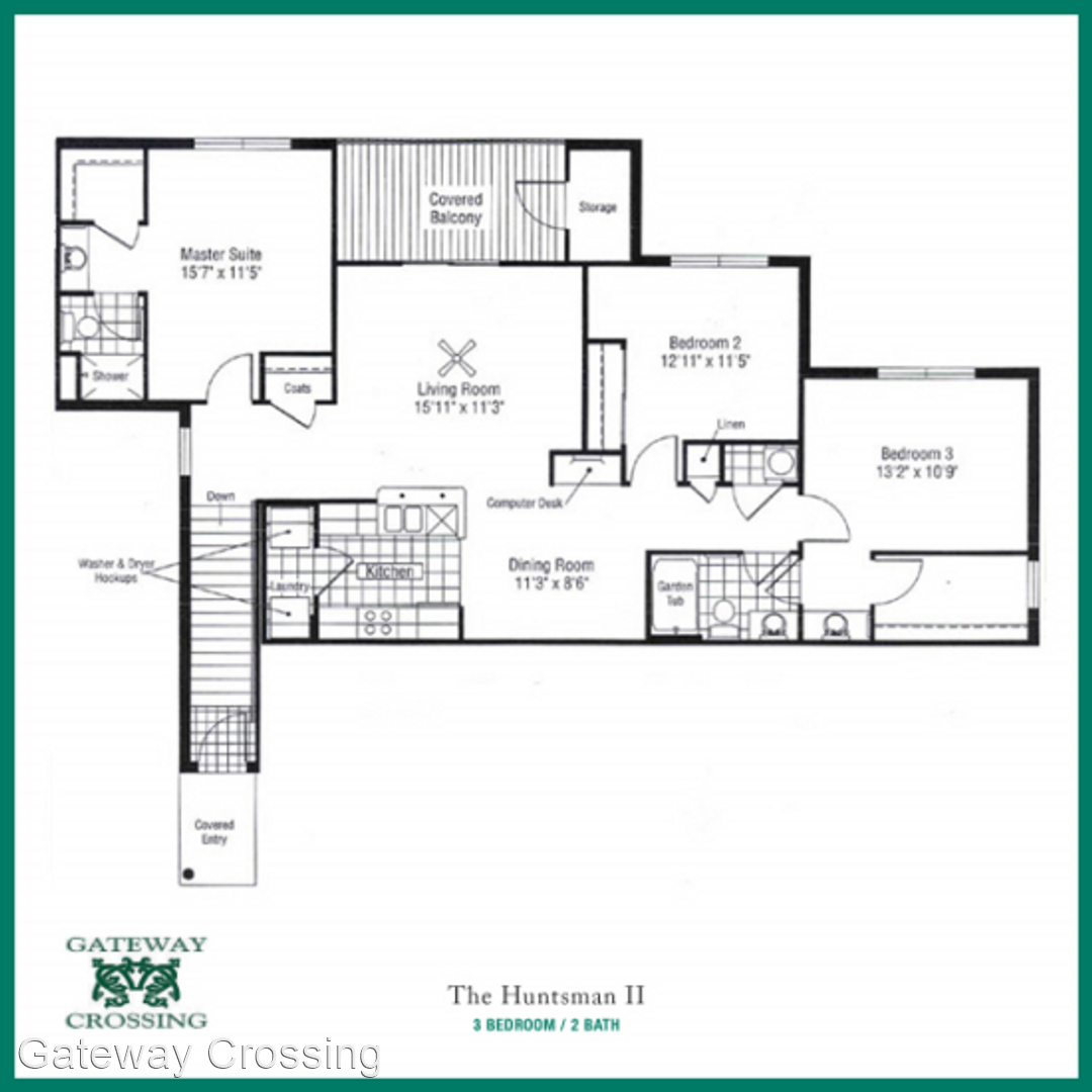 Huntsman II Floorplan - This 3 bedroom apartment, the “Huntsman II,” features 1,334 square feet! The private entry to the apartment is through a beautifully landscaped and lighted courtyard. The apartment’s entry features tile flooring and private interior stairs that lead to the living room and first bedroom. The apartment’s living room is very spacious with room for a full size couch, love seat or chair, coffee table, and entertainment center. Off of the living room is a private 13 x 7 patio with 7 x 3 storage closet. The apartment has an open concept with the living room, kitchen, and dining room all being open to each other, creating a great space for entertaining. The kitchen is perfect with oak cabinetry and newer appliances including a built-in microwave, dishwasher, stove and refrigerator. Attached to the kitchen is a full size washer/dryer connection. On the opposite side of the kitchen is a dining room with chair rail and room for a table for six! In the hallway is a built-in computer desk. This apartment has three spacious bedrooms. The first bedroom, in the front of the apartment, is huge! This bedroom will not only accommodate a king size bed, but will accommodate the king size furniture to go along with it. This bedroom also has its own private bathroom with full size shower. The second bedroom, on the opposite side of the apartment, has space for a full size bed, includes a full size closet, and has a “nook” in the wall perfect for a dresser. Across the hall from this bedroom is another full bathroom with garden tub and hallway linen closet. The third bedroom is great. This bedroom has room for a queen size bed, dresser, and includes a huge 9 x 5 walk-in closet. A unique feature of this room is that it also includes its own private sink and private access to the hall bathroom. What a great apartment!