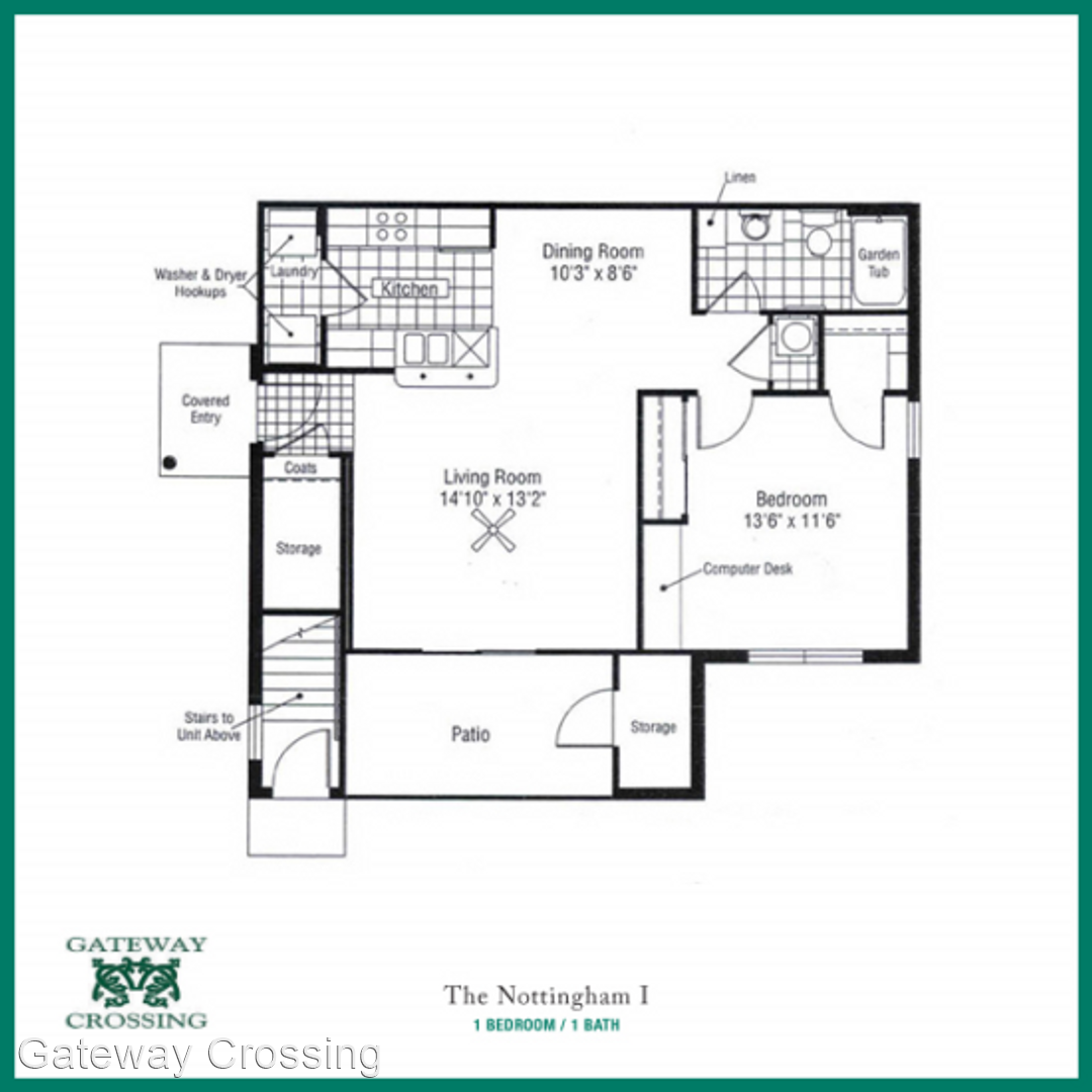 Huntsman II Floorplan - This 3 bedroom apartment, the “Huntsman II,” features 1,334 square feet! The private entry to the apartment is through a beautifully landscaped and lighted courtyard. The apartment’s entry features tile flooring and private interior stairs that lead to the living room and first bedroom. The apartment’s living room is very spacious with room for a full size couch, love seat or chair, coffee table, and entertainment center. Off of the living room is a private 13 x 7 patio with 7 x 3 storage closet. The apartment has an open concept with the living room, kitchen, and dining room all being open to each other, creating a great space for entertaining. The kitchen is perfect with oak cabinetry and newer appliances including a built-in microwave, dishwasher, stove and refrigerator. Attached to the kitchen is a full size washer/dryer connection. On the opposite side of the kitchen is a dining room with chair rail and room for a table for six! In the hallway is a built-in computer desk. This apartment has three spacious bedrooms. The first bedroom, in the front of the apartment, is huge! This bedroom will not only accommodate a king size bed, but will accommodate the king size furniture to go along with it. This bedroom also has its own private bathroom with full size shower. The second bedroom, on the opposite side of the apartment, has space for a full size bed, includes a full size closet, and has a “nook” in the wall perfect for a dresser. Across the hall from this bedroom is another full bathroom with garden tub and hallway linen closet. The third bedroom is great. This bedroom has room for a queen size bed, dresser, and includes a huge 9 x 5 walk-in closet. A unique feature of this room is that it also includes its own private sink and private access to the hall bathroom. What a great apartment!