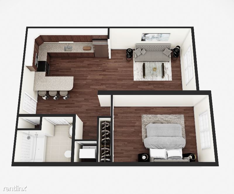Large 1BR/1BTH apartment with expansive kitchen, granite counters, stainless appliances, high ceilings, hardwood floors, in-unit washer/dryer, hardwood floors & spacious bedroom.