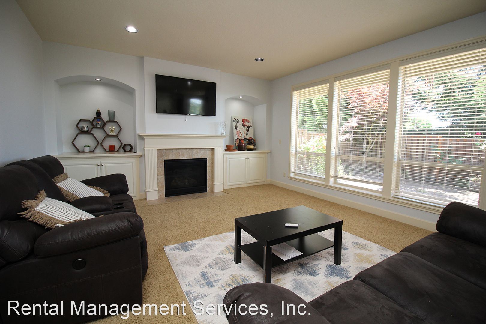 • Family Room with gas fireplace flanked by built-in cabinets and wall of windows overlooking the back patio