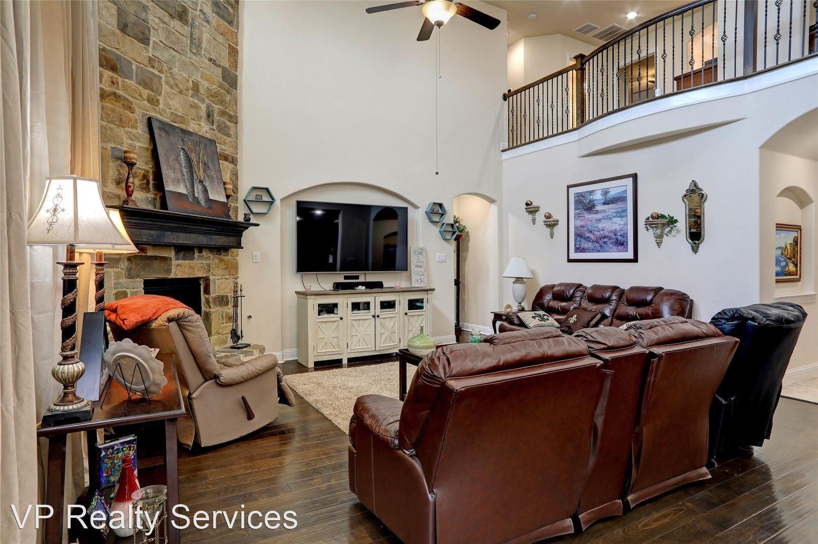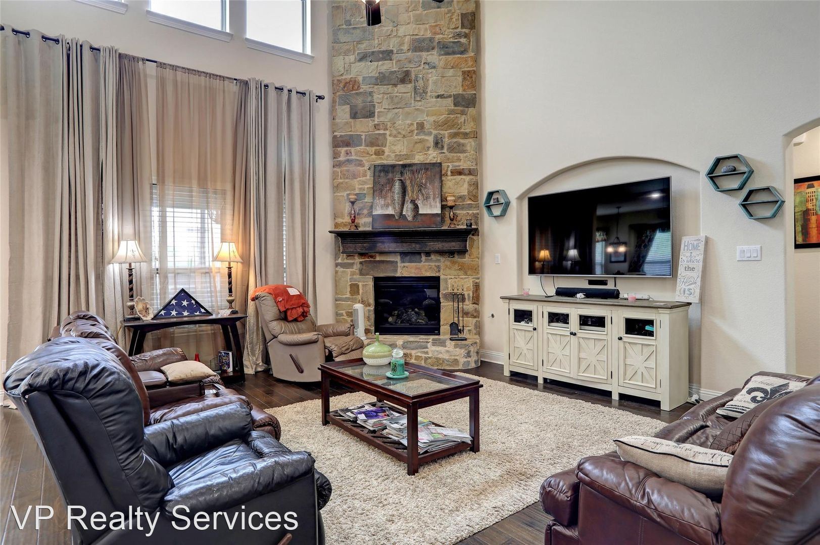 Welcome home! Beautiful four bedroom, three and a half bathroom home offers 3,846 sq. ft. of open living space. The kitchen offers granite countertops, tile backsplash, stainless steel appliances, a large island, and butcher pantry. The primary suite offers raised ceiling with fan, wall of windows, dual sinks in bath, storage cabinets, tile floors and separate shower. Gather around the floor-to-ceiling stone fireplace with gas logs in the den. The second story features loft overlooking the den, a private media room, living area and two large bedrooms. Enjoy back-yard view from the sun room complete with lighted ceiling fans. The back yard hosts an open patio with storage shed. Privacy is insured by wooden fence with steel posts.
