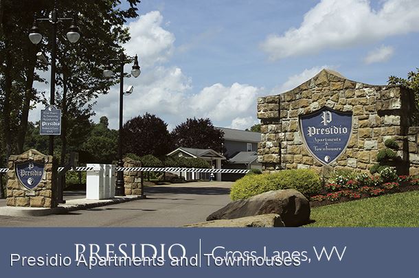 Discover More at Presidio - Presidio | 304.776.5406 1 Presidio Pointe | Cross Lanes, WV 25313 Discover More at Presidio. Nestled among 200 acres of wooded grounds, Presidio is an upscale, gated community where you can escape from city life without being miles away from it. Experience all the luxuries of a world-class resort, but with a hometown atmosphere. Presidio offers some of the largest floor plans in the area, one, two and three bedroom apartments and townhouses ranging from 1,370 – 2,110 square feet. Each unit features attached garages with remotes and enclosed climate-controlled common area hallways which allows you to stay warm and dry during bad weather. Conveniently located – another popular benefit you’ll enjoy living at Presidio. We are just one minute away from great restaurants, entertainment and shopping: • T.G.I. Friday's • Buffalo Wild Wings • Rocas Mexican Grill • Cracker Barrel Old Country Store • Regal Nitro Stadium 12 Cinemas • Mardi Gras Casino and Resort. • Walmart Supercenter • Lowe’s Home Improvement There is no doubt, Presidio is a wonderful place to call home. Once you see Presidio, you'll discover all the features and amenities other properties simply just don't offer. The many features and amenities you’ll enjoy at Presidio. • Garages with remotes • Large living rooms • Enclosed climate-controlled common area hallways • Ceramic tile entrances, kitchen and baths • Chef’s kitchen with a self-cleaning oven, microwave, frost-free refrigerator and ice maker, dishwasher and disposal • Ceiling fans in every room • Washer and dryer hookup • Large walk-in closets • Central heat and air • Low noise level • Direct TV satellite hookups • Private, covered patio/balcony* • Scenic wooded views* • Wine racks • Controlled-access gated community • Professional on-site management • 24-hour emergency maintenance • Storage facilities • Coin operated laundry facility • Luxury resort pool with fountain • 24-hour fitness facility • Tennis court • Basketball court • Volleyball court • Badminton court • Car wash area • Ball rebounder • 3-hole putting green • 40 acres of walking and mountain bike trails • Easy access to I-64 • Short drive to downtown Charleston *Available apartment features vary by unit size and floor plans. Presidio is owned by Pope Properties – We have been setting the standard for over 50 years. For more information visit popeproperties.com. Like us on Facebook at www.facebook.com/popeproperties